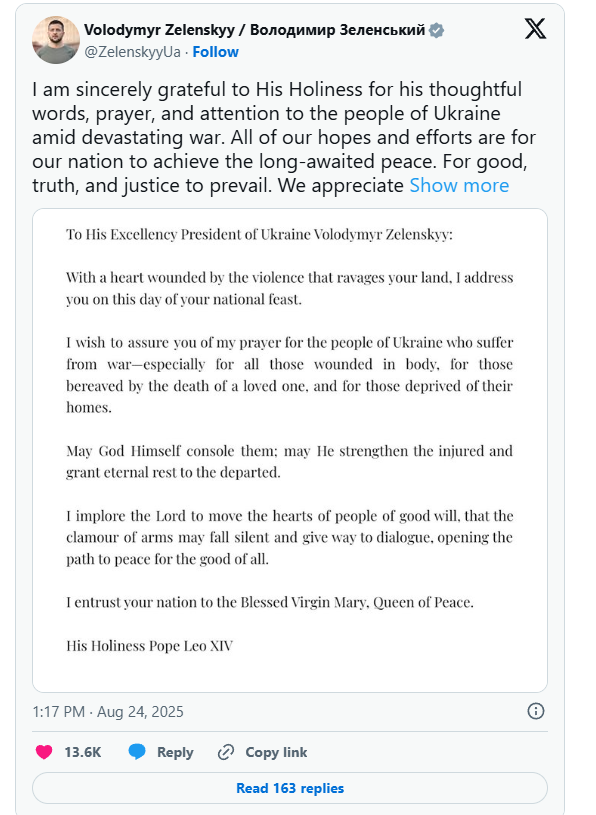 Vatican, 24/8/2025 – Nhân dịp Quốc khánh Ukraina, Tổng thống Volodymyr Zelenskyy đã công bố bức thư của Đức Thánh Cha Lêô XIV, trong đó ngài cầu nguyện cho người dân đang chịu đau khổ vì chiến tranh và tha thiết kêu gọi: “Xin cho tiếng súng im bặt để nhường chỗ cho đối thoại.”