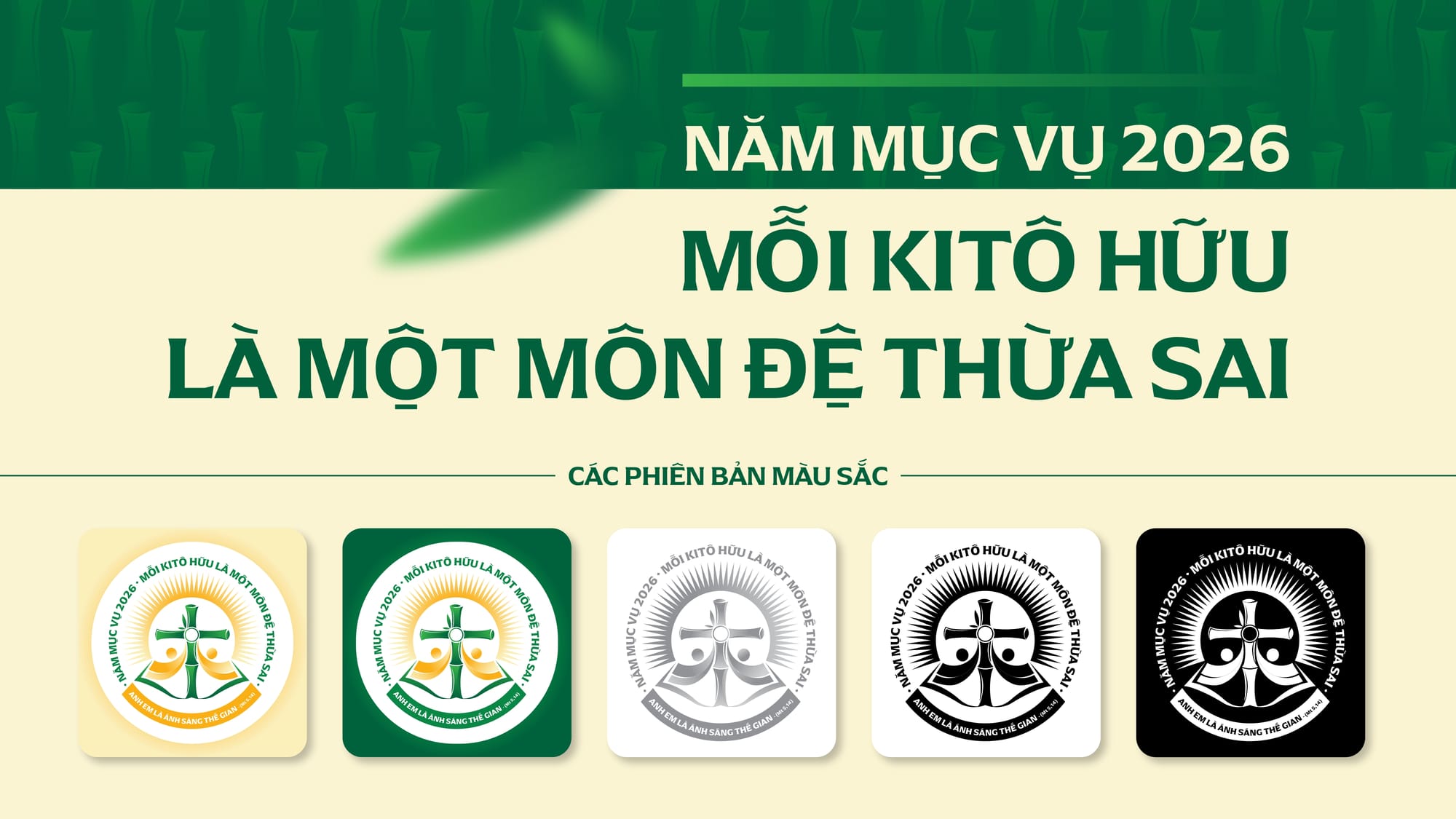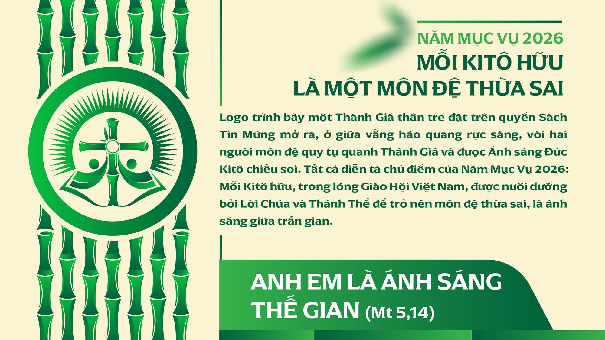 Văn phòng Thư ký Hội đồng Giám mục Việt Nam vừa chính thức giới thiệu mẫu logo cho Năm Mục vụ 2026. Với chủ đề “Mỗi Kitô hữu là một môn đệ thừa sai” cùng lời hiệu triệu từ Tin Mừng Mát-thêu: “Anh em là ánh sáng thế gian” (Mt 5,14), logo mang những biểu tượng sâu sắc về căn tính và sứ mạng của người Công giáo tại Việt Nam.