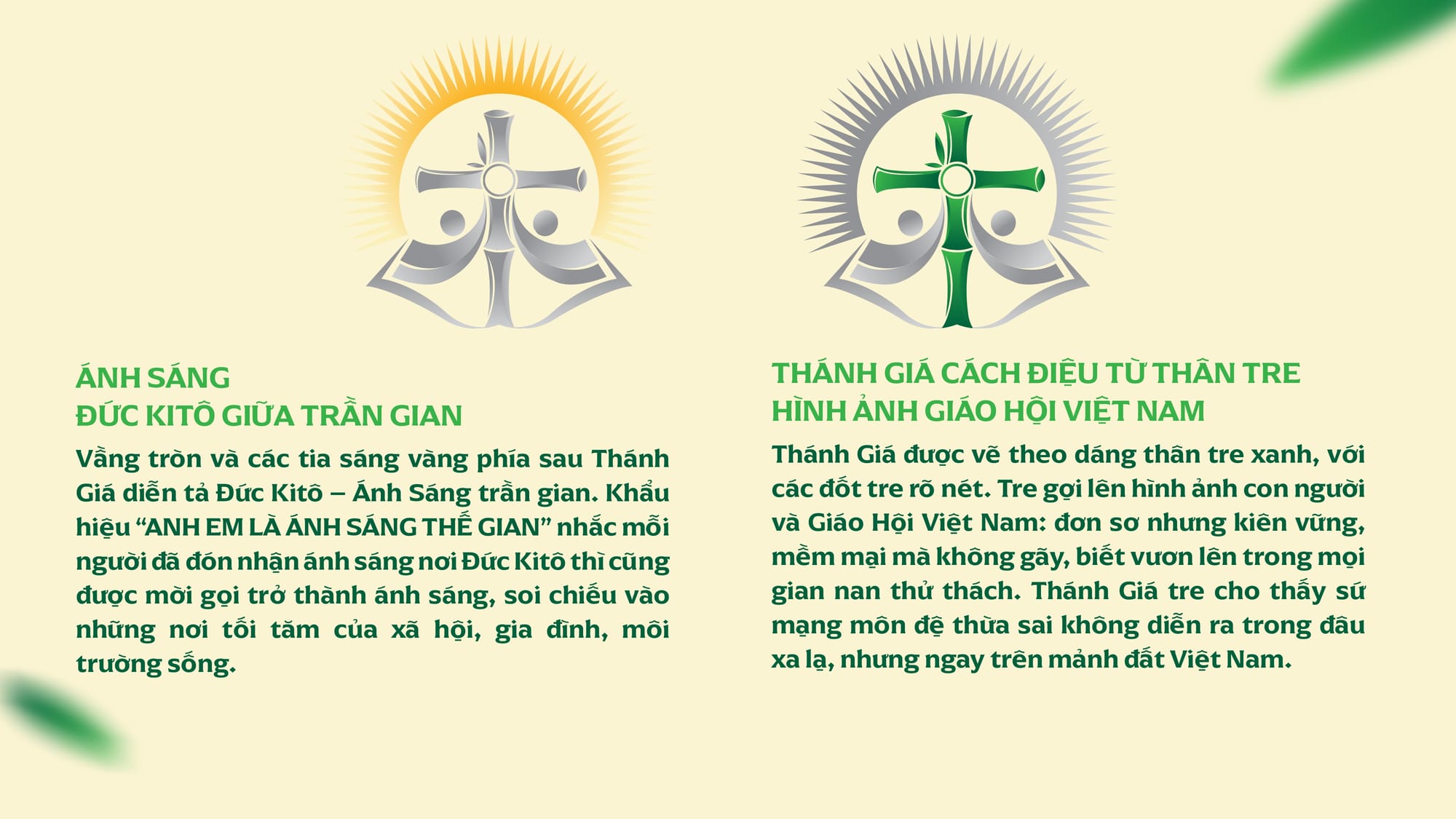 Một nét độc đáo mang đậm bản sắc văn hóa là hình ảnh Thánh Giá thân tre. Thánh Giá được vẽ cách điệu theo dáng thân tre xanh với các đốt rõ nét. Cây tre gợi lên hình ảnh con người và Giáo Hội Việt Nam: đơn sơ nhưng kiên vững, mềm mại mà không gãy, biết vươn lên trong mọi gian nan thử thách. Đồng thời, Thánh Giá tre nhắc nhở rằng sứ mạng môn đệ thừa sai không diễn ra ở đâu xa lạ, nhưng ngay trên mảnh đất Việt Nam.