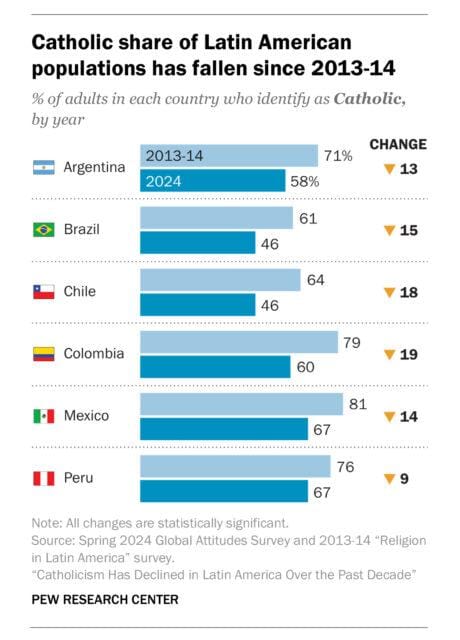 Theo khảo sát, Công giáo ghi nhận mức sụt giảm tại tất cả các quốc gia được nghiên cứu. Colombia là nơi giảm mạnh nhất: năm 2024, chỉ còn 60% người trưởng thành tự nhận là Công giáo, so với 79% trong giai đoạn 2013–2014. Mức giảm thấp nhất được ghi nhận tại Peru — quốc gia nơi Pope Leo XIV từng thi hành sứ vụ hơn hai thập niên — với tỷ lệ Công giáo giảm từ 76% xuống còn 67% trong cùng giai đoạn.