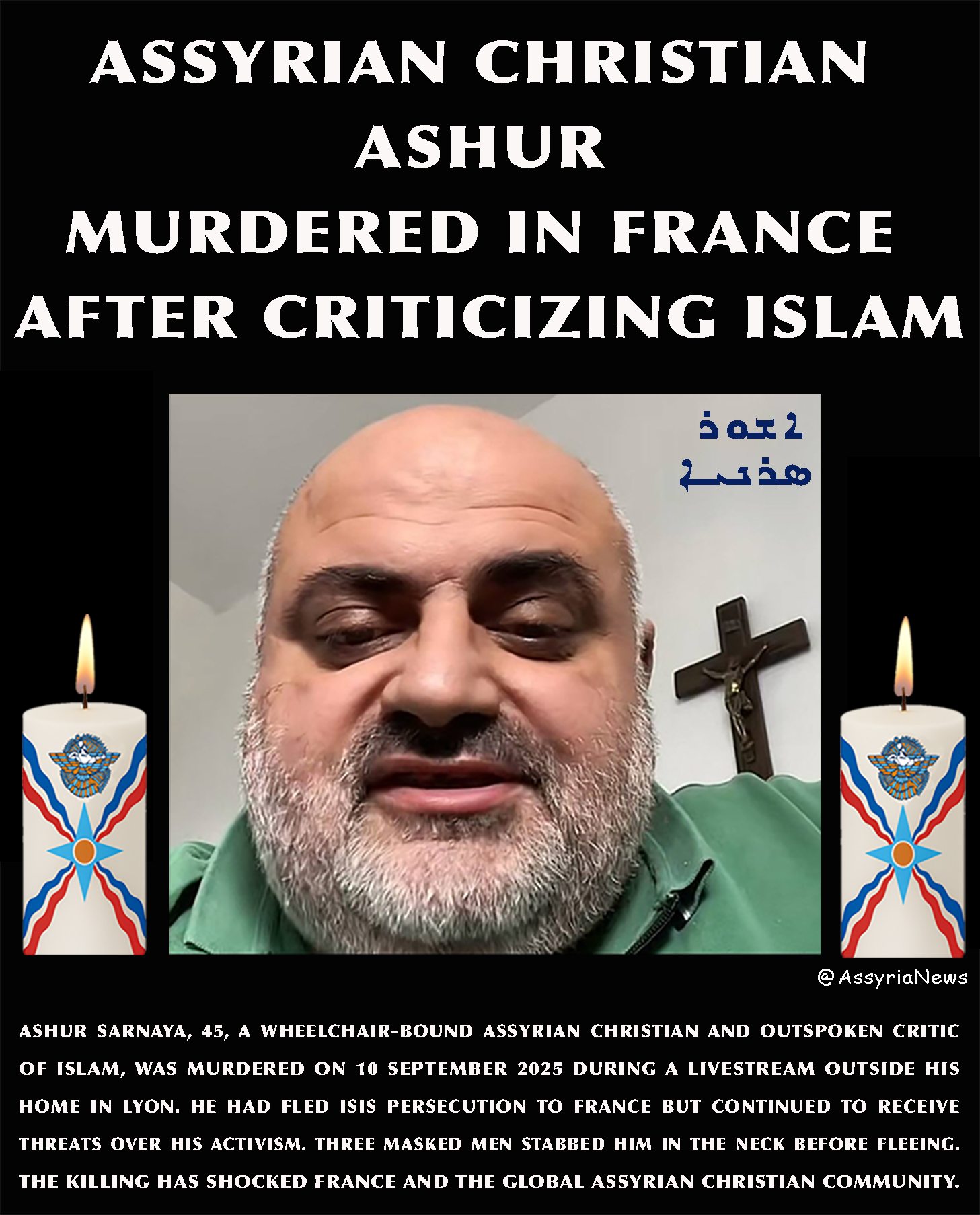 Ngày 10/9/2025, Ashur Sarnaya, một Kitô hữu Assyrian 45 tuổi bị tàn tật, đã bị tấn công và sát hại tại Lyon, Pháp, khi đang phát trực tiếp trên TikTok – nền tảng ông thường dùng để chia sẻ đức tin Kitô giáo. Sinh ra tại Ankawa, Iraq, Ashur đã trốn sang Pháp cùng gia đình vào năm 2014 để thoát khỏi sự đàn áp của ISIS. Vụ tấn công diễn ra gần căn hộ của ông ở quận 9 Lyon, nơi ông bị đâm vào cổ. Những đoạn video trên livestream ghi lại khoảnh khắc kinh hoàng khi ông gắng gượng thở. Một nhân chứng quay được cảnh một người trẻ mặc đồ tối, trùm mũ, chạy khỏi hiện trường, được cho là kẻ gây án.