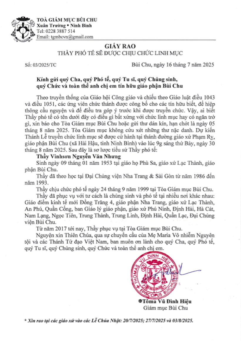 Việc rao chức sẽ được thực hiện tại các giáo xứ trong Giáo phận Bùi Chu vào các Chúa Nhật: 20/7, 27/7 và 3/8/2025.