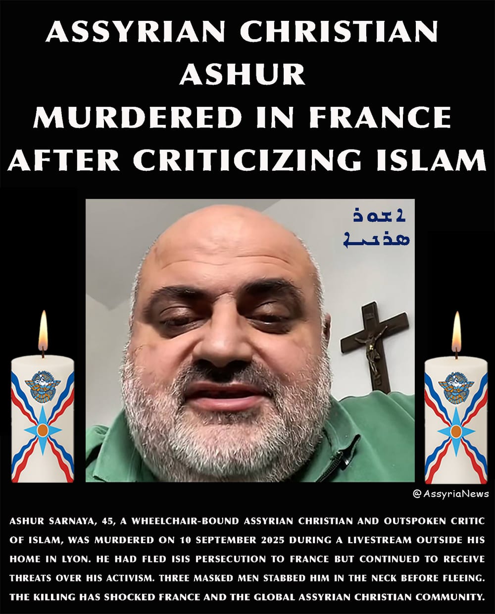 Ngày 10/9/2025, Ashur Sarnaya, một Kitô hữu Assyrian 45 tuổi bị tàn tật, đã bị tấn công và sát hại tại Lyon, Pháp, khi đang phát trực tiếp trên TikTok – nền tảng ông thường dùng để chia sẻ đức tin Kitô giáo. Sinh ra tại Ankawa, Iraq, Ashur