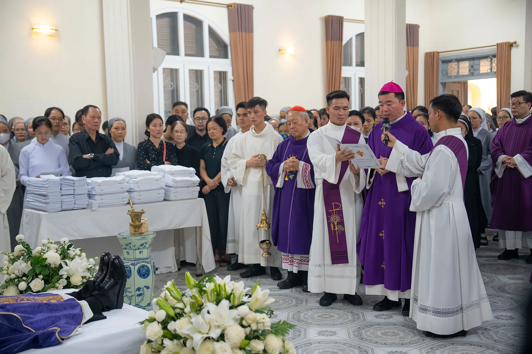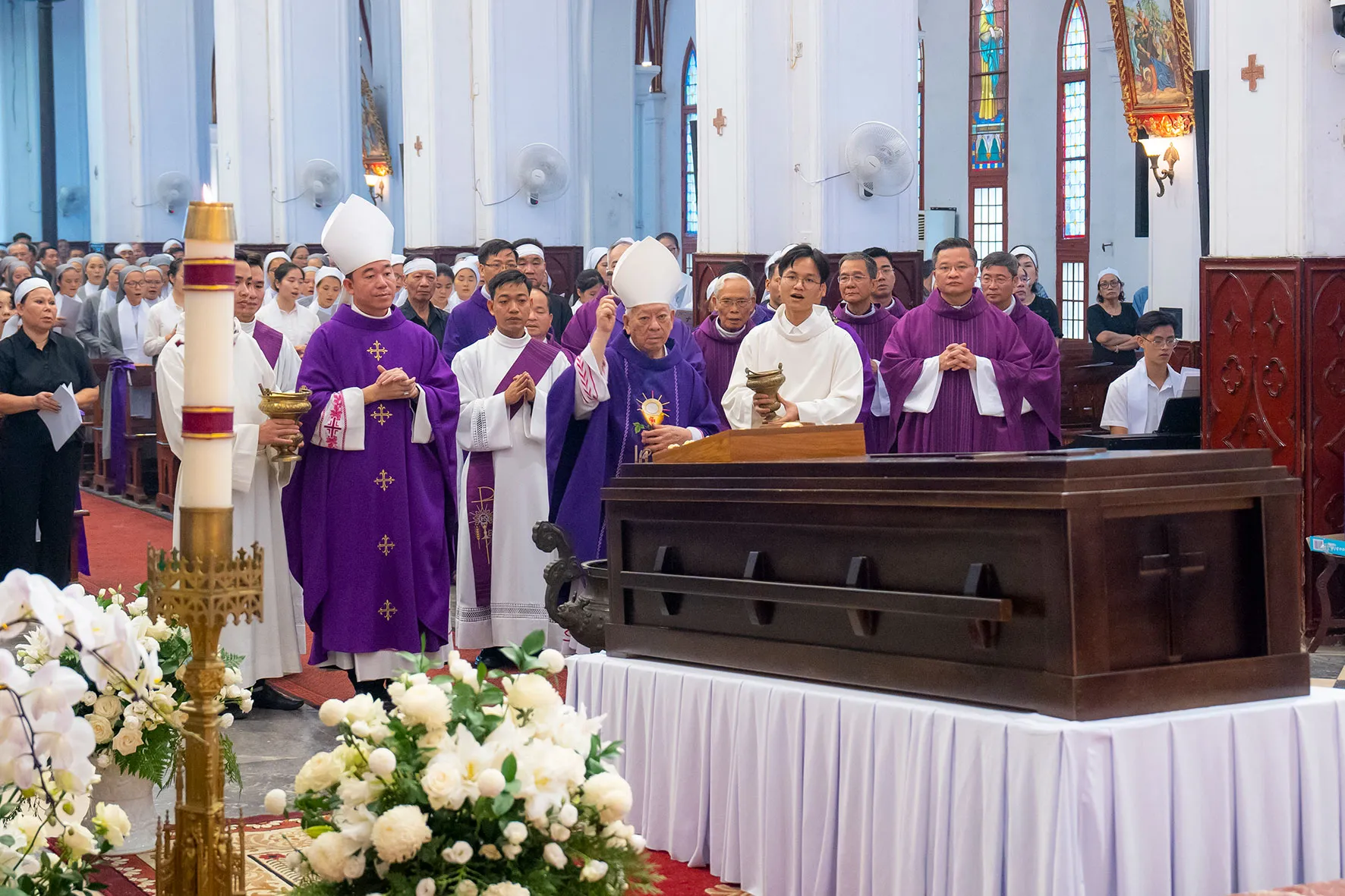 Thánh lễ diễn ra trong bầu khí linh thiêng. Mỗi lời cầu nguyện, mỗi cử hành phụng vụ đều chất chứa tâm tình tri ân và tín thác. Cuối lễ, quý đấng bậc và cộng đoàn tiến lên linh cữu, rảy nước thánh và cúi mình tiễn biệt vị mục tử hiền lành đã hoàn tất hành trình dương thế trong bình an.