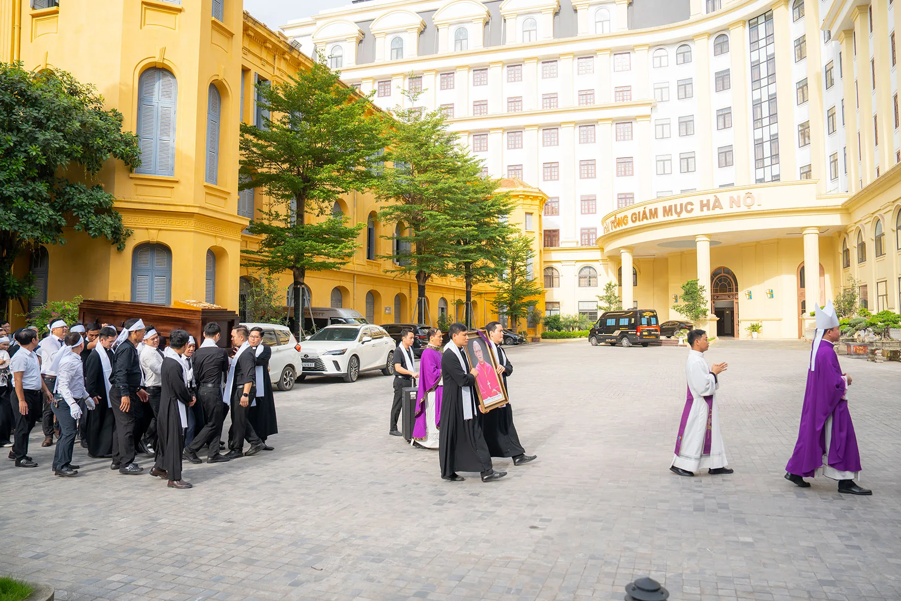 Sau nghi thức, linh cữu Đức cha được cung nghinh về Nhà thờ Chính Tòa Hà Nội, nơi ngài từng dâng Thánh lễ và phục vụ trong nhiều năm.