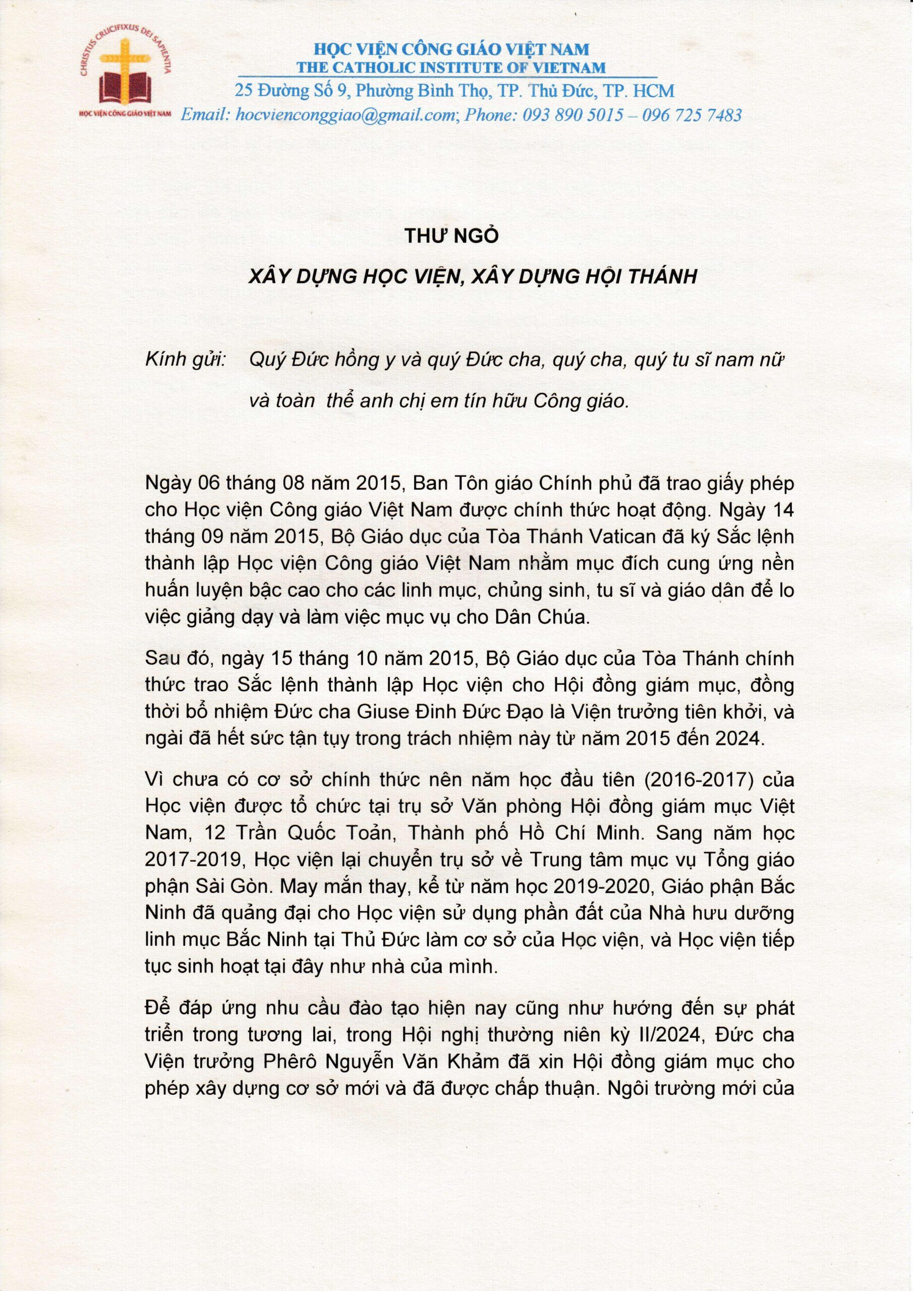 Đức cha Phêrô Nguyễn Văn Khảm, Viện trưởng Học viện Công giáo Việt Nam đã có thư ngỏ về việc xây dựng Học viện. Sau đây là nguyên văn thư ngỏ của Đức cha Phêrô: