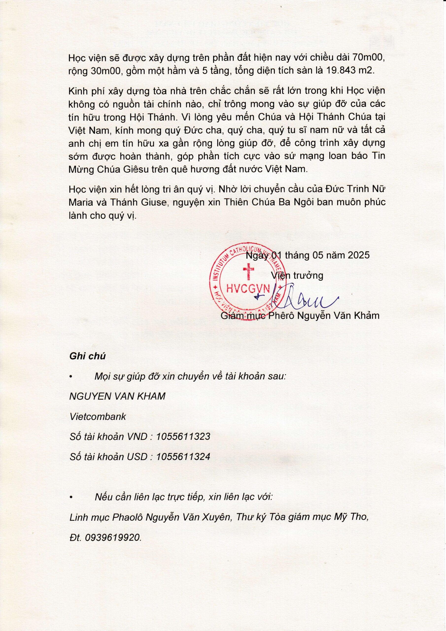 Vì lòng yêu mến Chúa và Hội Thánh Chúa tại Việt Nam, kính mong quý Đức cha, quý cha, quý tu sĩ nam nữ và tất cả anh chị em tín hữu xa gần rộng lòng giúp đỡ, để công trình xây dựng sớm được hoàn thành, góp phần tích cực vào sứ mạng loan báo Tin Mừng của Chúa trên quê hương đất nước Việt Nam.