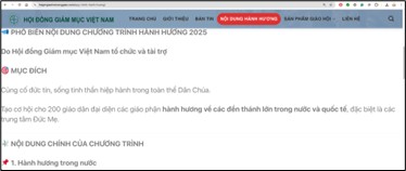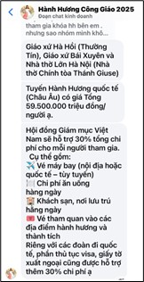 Theo thông tin từ Văn phòng Hội đồng Giám mục, nhóm này hoạt động qua trang Facebook “Hành hương Công giáo 2025” (facebook.com/giaochuaconggiao2025) và trang web hdgmgiaohoiconggiao.com. Các nội dung được đăng tải cho biết: “Hội đồng Giám mục sẽ hỗ trợ 30% tổng chi phí cho mỗi người tham gia” chương trình hành hương – thông tin này bị xác nhận là giả mạo.